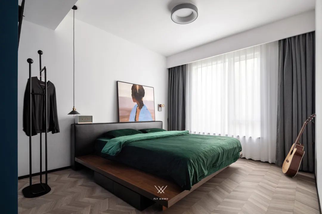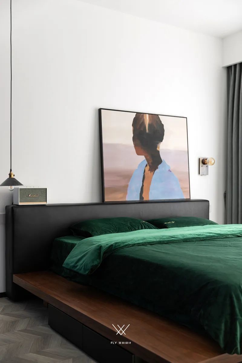 ▲卧室以简洁的墙面空间,布置黑色皮艺靠背的实木床,布置墨绿色的床铺,床头靠放一幅人像装饰画,边上放置一个衣帽架,也为主人提供了一个自然从容的卧室氛围。
