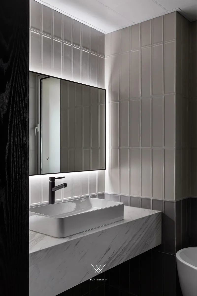 ▲卫生间墙面贴着条形砖,加入雅白的洗手台+台上盆,洗手盆加入镜柜+背光灯带的设计,也是显得更加干净优雅而明亮大气。