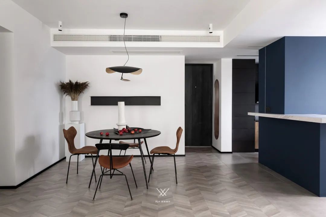 ▲餐厅与厨房之间采取开放式的设计,中间隔着一个蓝色的中岛台与隔断,让空间显得安静通透而又私密独立。
