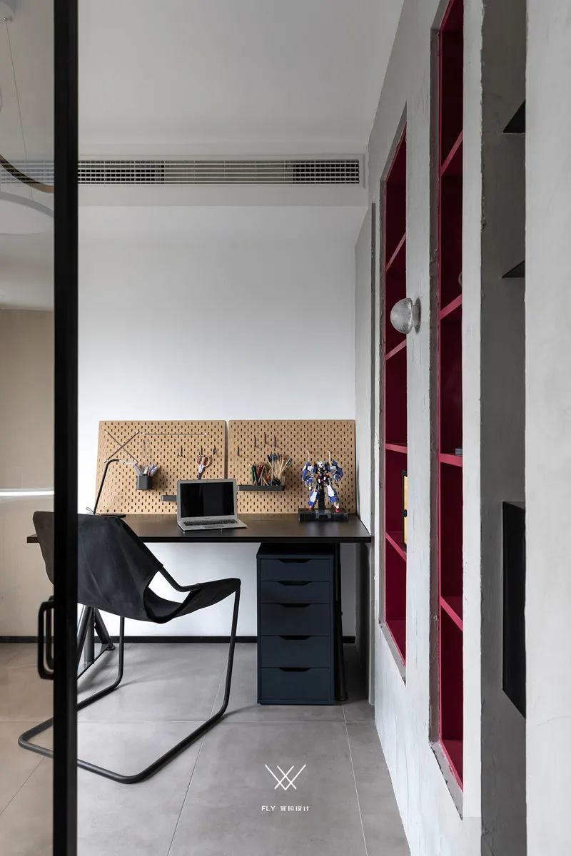 ▲书房侧边加入开放格架设计,靠墙角布置黑色的书桌,墙面上加入洞洞板收纳架的设计,也让空间充满文艺与实用的工作台体验。