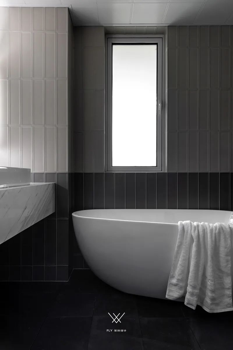 ▲卫生间里还加入了一个浴缸的设计,深色地面+深灰色墙脚+灰色墙身砖的设计,让空间显得更加稳重端庄有层次。