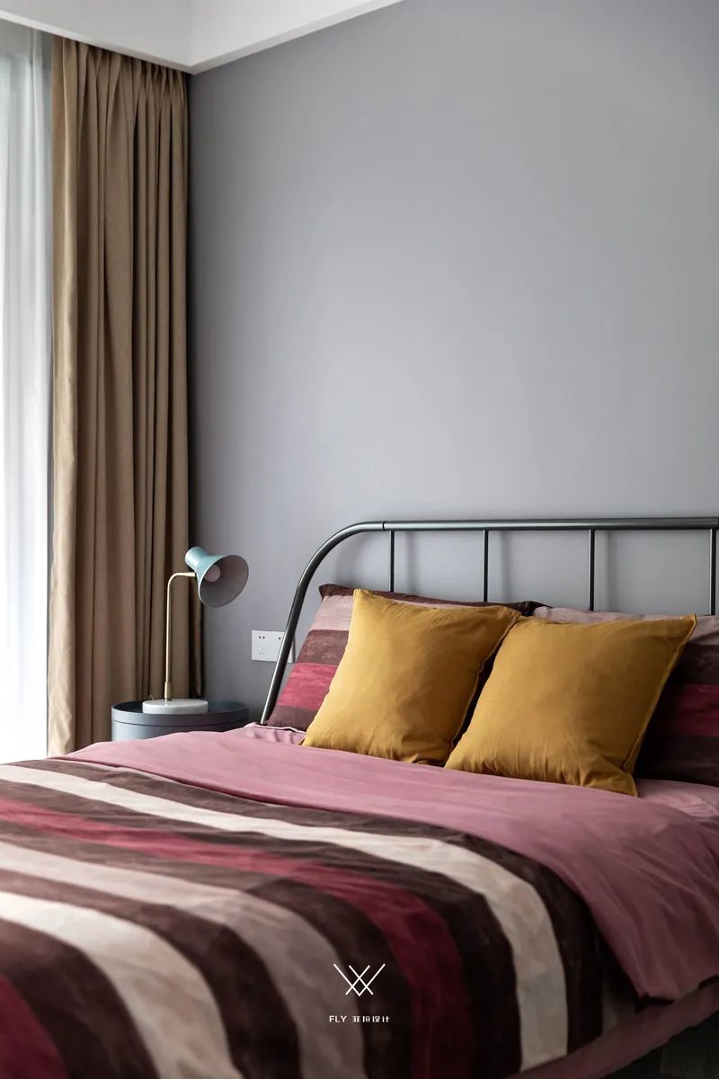 ▲次卧以简约灰色的墙面空间,布置极简的铁艺床,布置红色的的床单、黄色抱枕,呈现出一种时尚简约的氛围感。