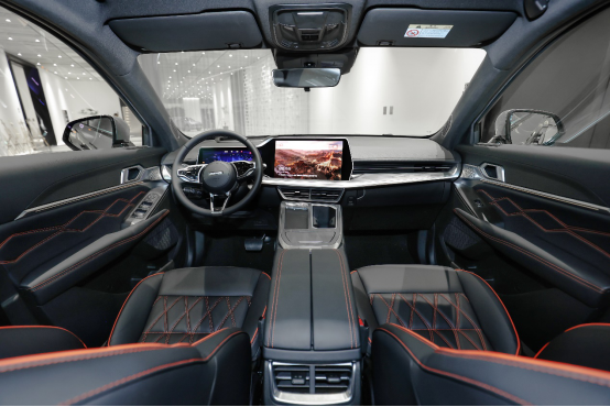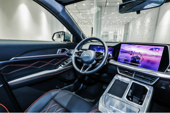 来到车内,哈弗神兽采用“时空御守”内饰布局,中国自主品牌在内饰的用料上向来是不会让人失望的,一方面极简的内饰造型为数字化座舱营造了很好的氛围;另一方面,大量软性材料的应用,结合车内多色氛围灯增添了居家舒适感,先锋科技和温柔浪漫两种元素被设计师巧妙的融合在一起,