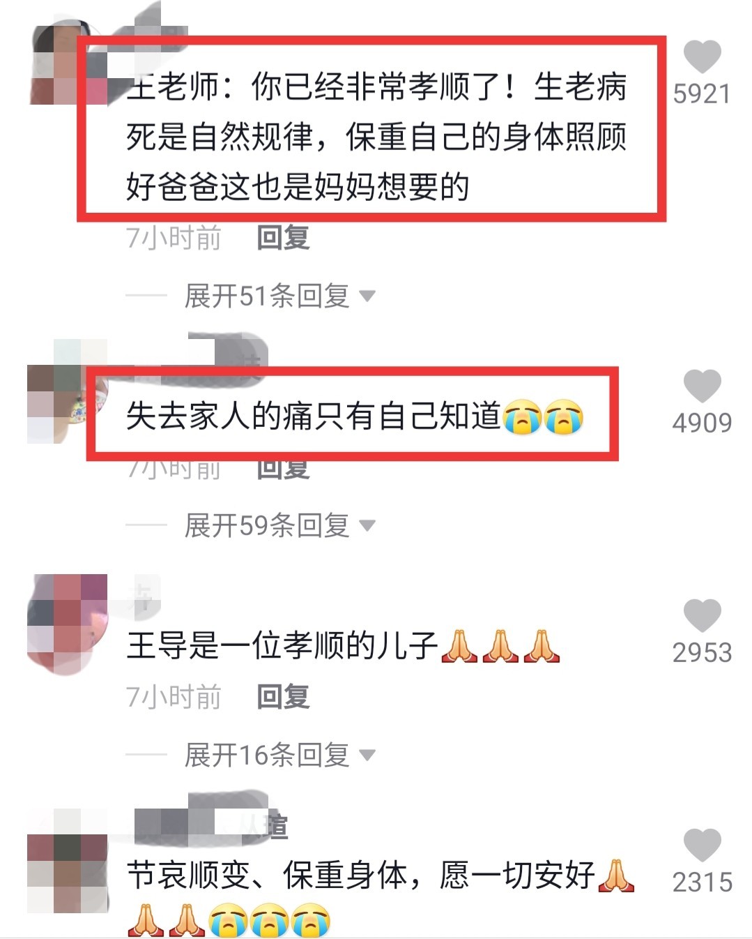此视频一出,立马引起不少网友共情。有网友安慰王为念已经十分孝顺,希望王为念能注意自己的身体。还有网友表示:失去家人的痛只有自己知道。