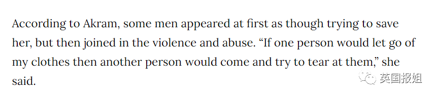 从数百人的凝视、触摸再到撕衣服,Ayesha就像一块物件被抢来抢去,期间不是没有正义之士想拯救她,但Ayesha回忆,起初也有男性试图劝说大众,但在周围的起哄奚落声中,他们也加入到侵犯的行列。