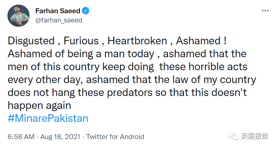 “厌恶、愤怒、难过、羞愧!作为男人我感到十分羞愧,为这个国家每天还在做这些事的男人感到羞愧,为我们国家没有用绞刑处决这帮人渣感到羞愧!”