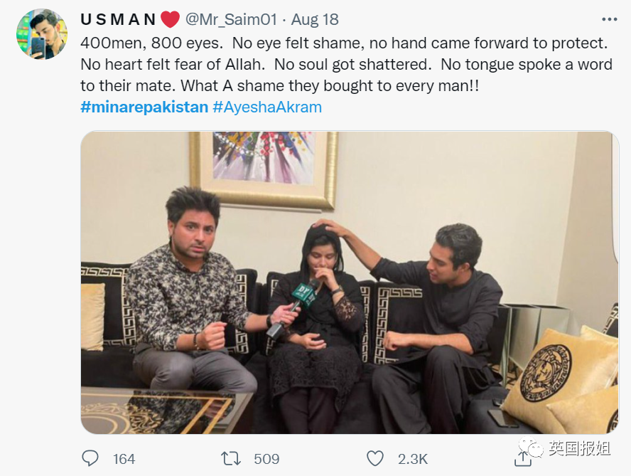 8月15日,即集体猥亵事件发生的第二天,Ayesha照例在网上发布了自己的视频,但让所有人“失望”的是,视频中的Ayesha的表现实在太过冷静,仿佛前一天什么都没发生一样,并没有经历过一个恐怖事件后的“恐惧”“难过”和“悲伤”。