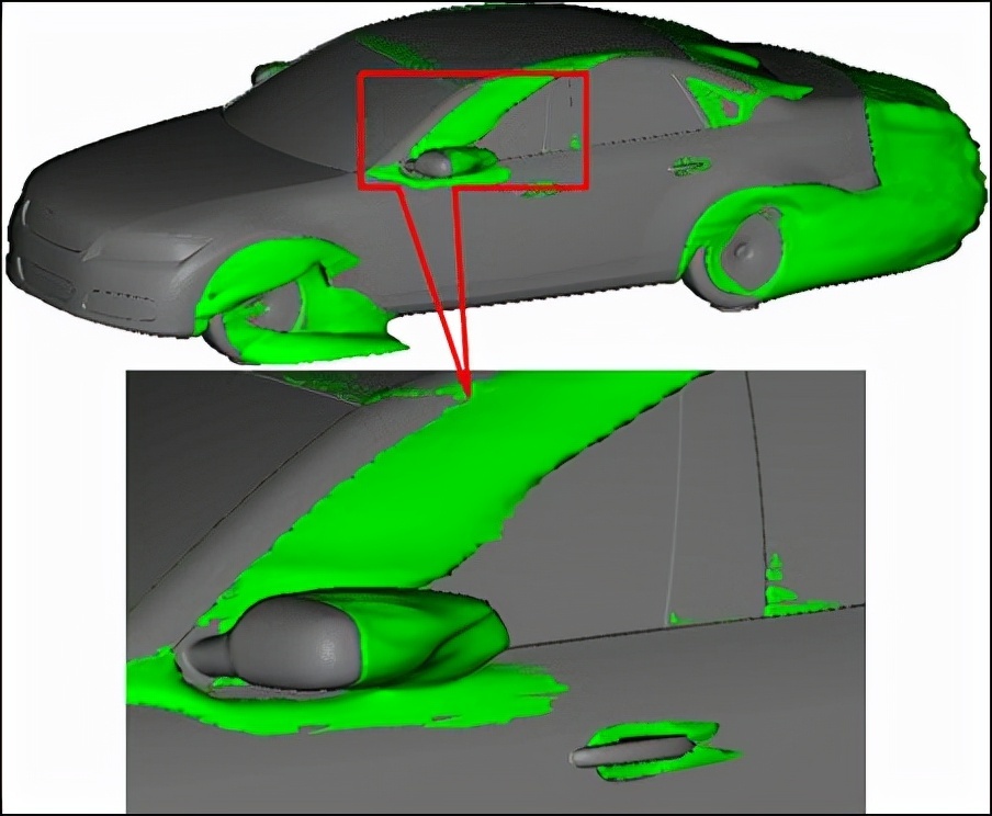 更要命的是,后视镜外壳的边缘与镜面基本是个直角,突兀的边缘会产生大量紊乱的湍流。所谓湍流区别于正常的层流,空气随机而混乱的运动。在舒适性层面,湍流空气无规律地“敲打”车身,这会对车内噪音的控制(NVH)造成不利影响。