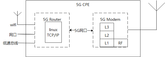 5G CPE由5G Modem和5G Router 2部分组成,如图2所示,5G Modem负责5G UE协议栈、基带、射频处理,将5G信号转化为网口信号。5G Router负责路由功能,将5G Modem的网口数据转化为局域网内 Wi-Fi 或者网口数据。本文主要针对5G CPE Router中的Linux TCP/IP以及网卡驱动进行优化研究,实现5G CPE传输性能的提升。