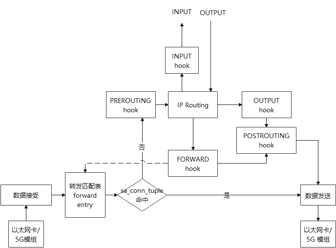 为了解决5G CPE传输的性能瓶颈问题,本文提出了包加速技术,即对Linux中的TCP/IP报文进行快速转发,达到性能提升目的。如图4所示,网卡接收到数据包如果sa_conn_tuple五元组未命中,数据转交给IP Routing路径,按照Linux 标准IP包处理流程处理,此时IP_Forward在FORWARD hook将flow entry加入到forward entry表中。如果命中sa_conn_tuple五元组,获取forward entry项里的路由项,解析出发送网卡的信息,直接转发到对端网卡。
