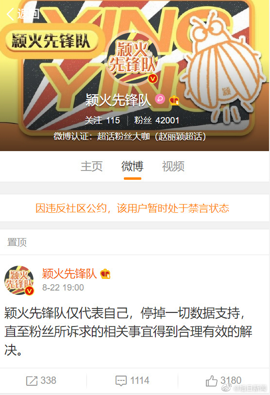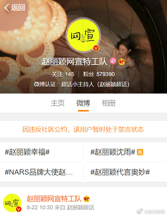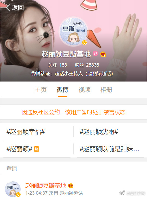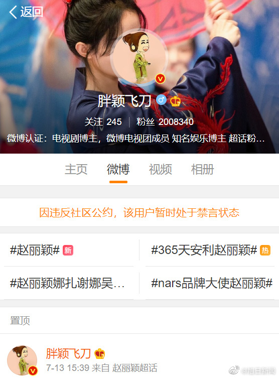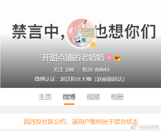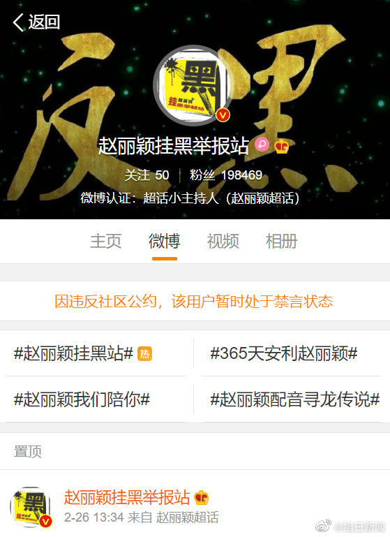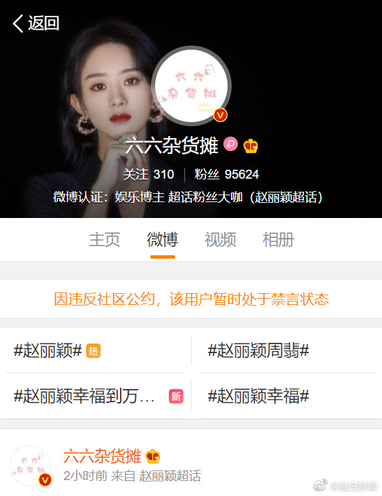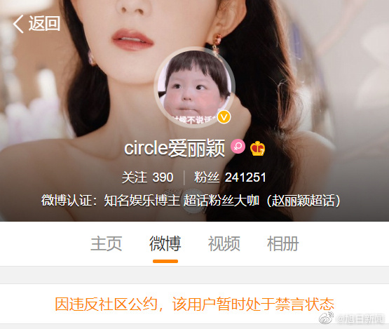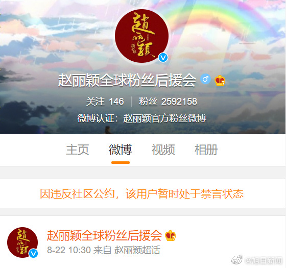 下午,@赵丽颖微吧、@赵丽颖全球粉丝后援会、@赵丽颖吧官博、@赵丽颖网宣特工队、@赵丽颖挂黑举报站、@胖颖飞刀、@赵丽颖豆瓣基地、@六六杂货摊、@颖火先锋队、@开甜点铺的老奶奶、@颖火护卫·赵丽颖、@circle爱丽颖 等赵丽颖核心粉丝账号均被禁言。