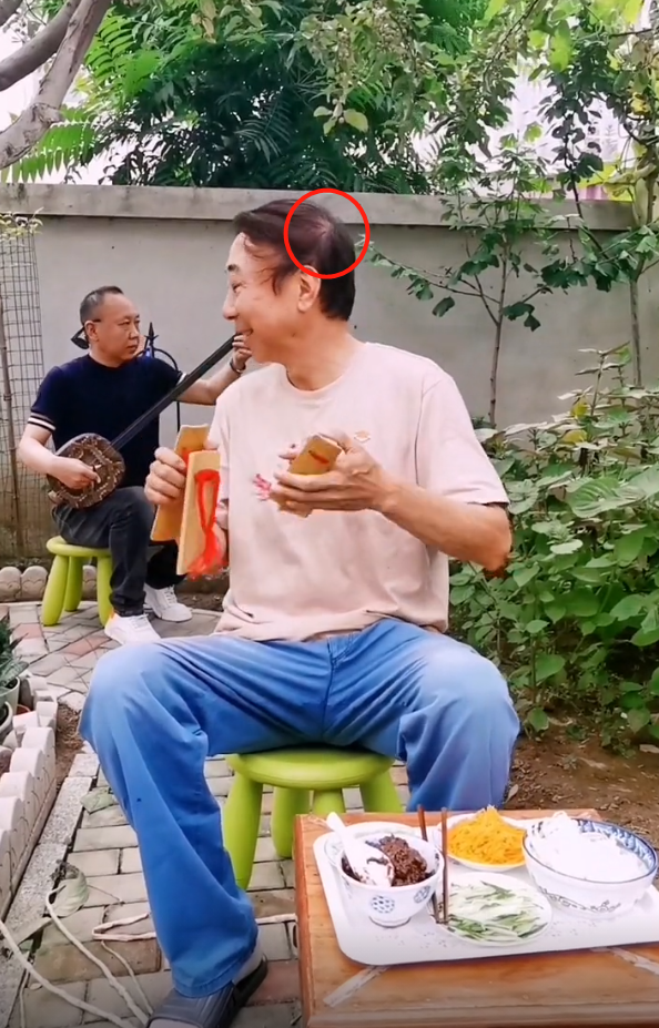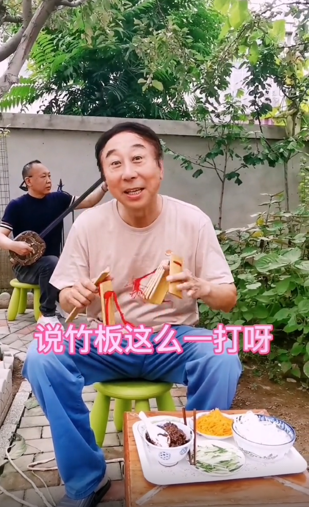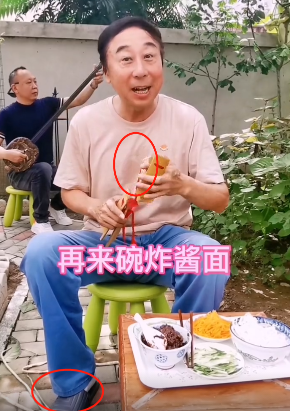 快板打到一半,冯巩老师说到了炸酱面,刚好面前就摆好了炸酱面。值得注意的是,冯巩老师脚上只穿了一双拖鞋,果然是自家院子,舒适自在最重要,可以看到冯巩老师的衣服上有些汗渍,不过冯巩老师不嫌热,快板打得十分开心。