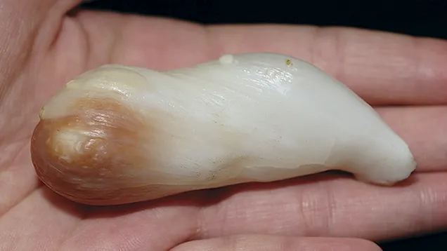 虽然珍珠颜色种类丰富,但一颗珍珠上并不会出现不同的颜色。可砗磲珍珠却并非如此。这颗被送到一家台北的宝石研究所的砗磲珍珠上就出现了白色和棕褐色两种颜色。
