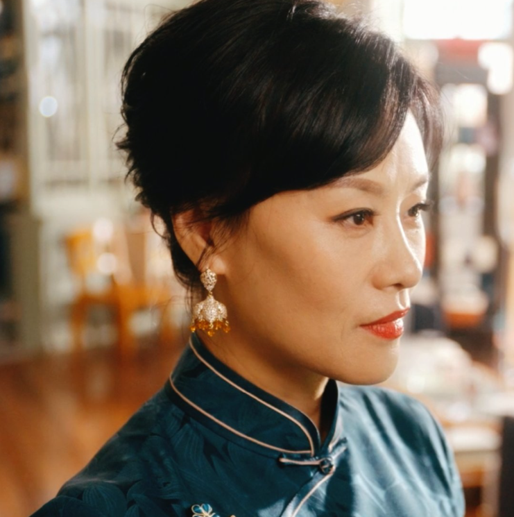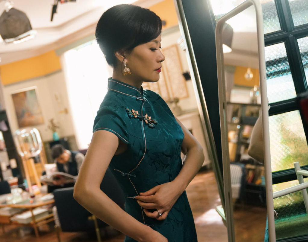 在曝光的剧照中,邬君梅身着藏蓝色旗袍,化着精致的妆容,佩戴着贵重的耳饰,将头发盘在身后,双手扶着臀与细腰,举手投足间尽显优雅大方。