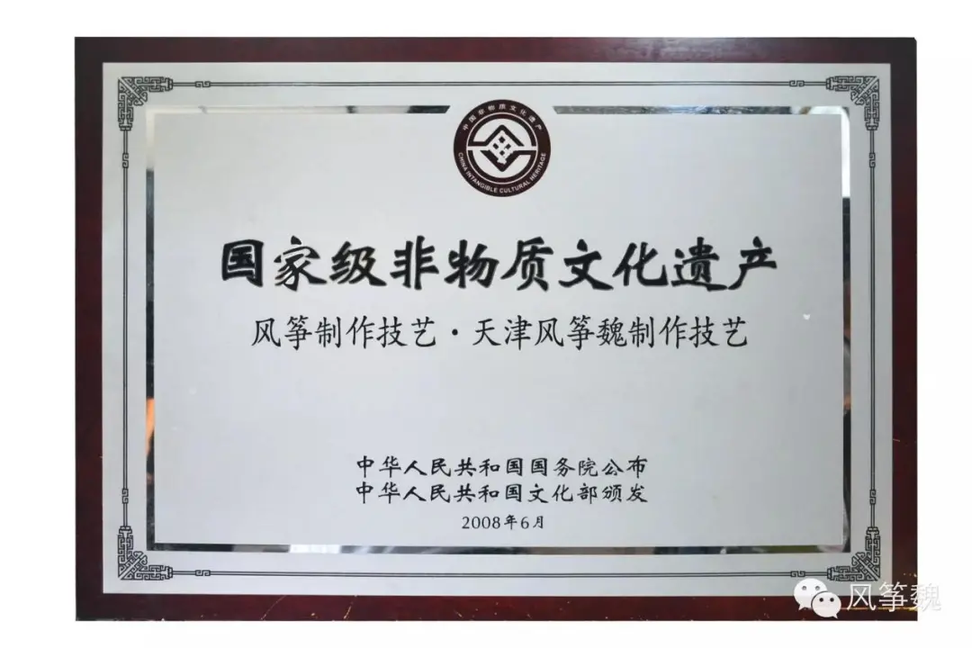天津“风筝魏”风筝制作技艺于1984年,被国家轻工业部定为中国78项著名民间艺术项目之一;“风筝魏”的产品于2007年,被国家旅游局定为中国著名地方特产;天津“风筝魏”风筝制作技艺于2008年,被国家文化部定为中国首批国家级非物质文化遗产名录。