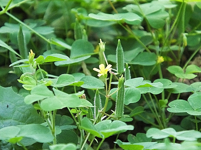 酢浆草始载于《新修本草》,为酢浆草科酢浆草属植物酢浆草Oxalis corniculata L.的全草,多年生草本,根茎细长,茎细弱,常褐色,甸甸或斜生,多分枝,被柔毛;小叶3片,倒心形,可用于制作书签;花黄色,花朵一般只在阳光下盛开;果实近圆柱形,略具5棱,有缘,像迷你版小秋葵,味酸,可少量食用;果实成熟时会弹裂,种子深褐色,近卵形而扁,有纵槽纹;花期5-8月,果期6-9月;由于它的外观非常漂亮,也有人会将其挖回家做盆栽,目前网上也有专门出售酢浆草盆栽的商家。