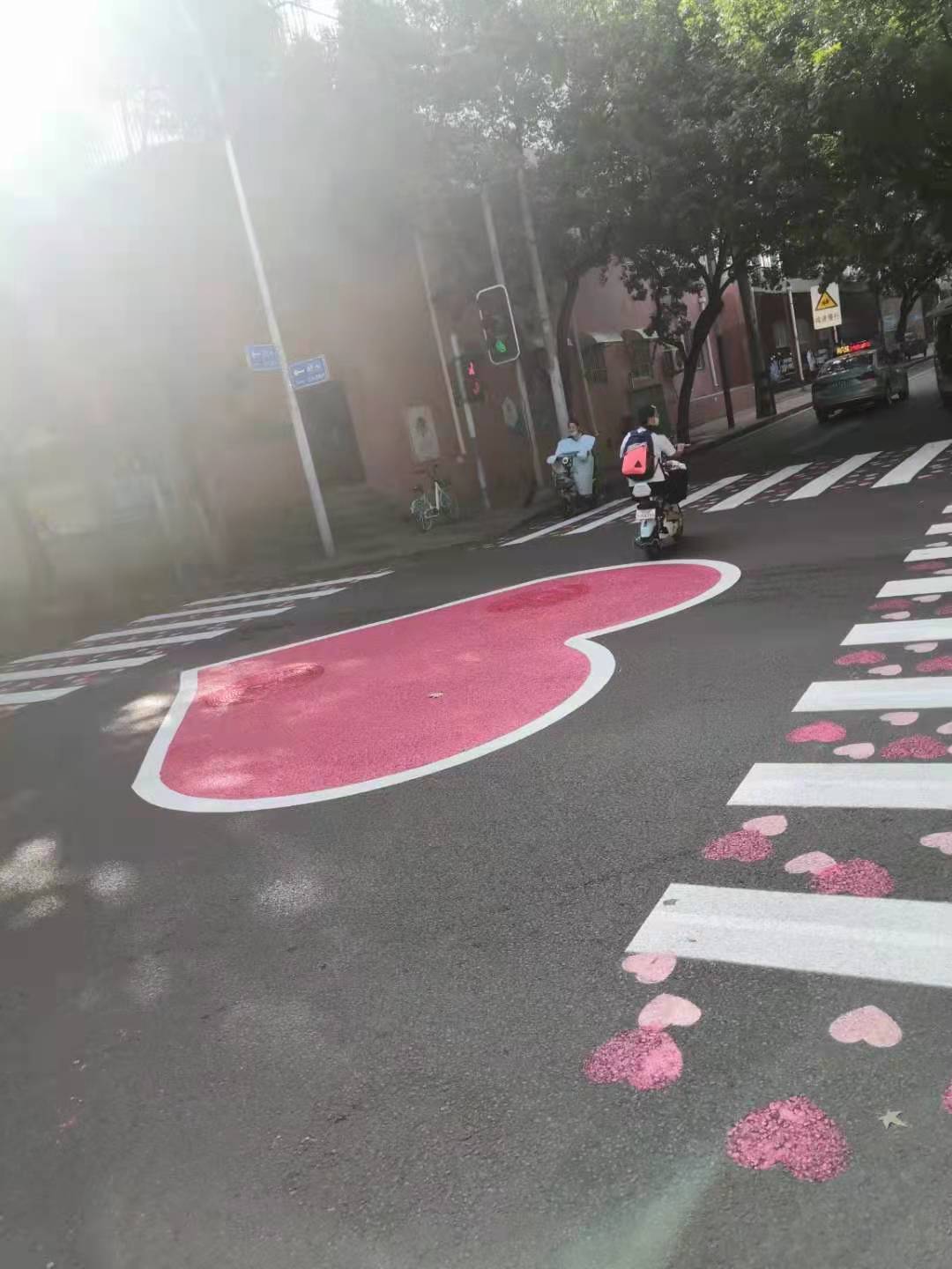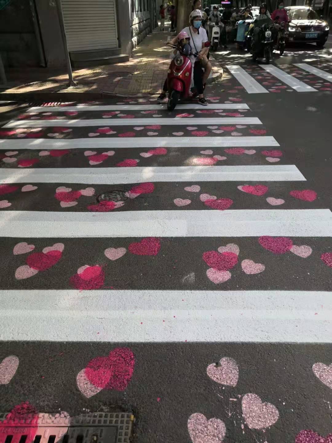 在济南的经三纬三的路口,不光有爱心红路灯,还有爱心斑马线。