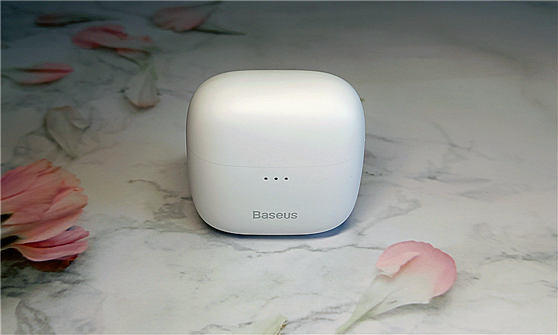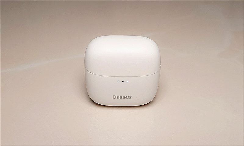 此次试用的是白色款倍思E8,它的充电盒为扁圆形,尺寸约为45*45*25mm,壳体为ABS+PC材质,表面是哑光磨砂涂层;机身正面印有浅灰色的Baseus品牌LOGO,品牌辨识度高。