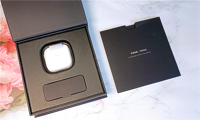 包装盒最外层是纸套封,内盒是一纯黑纸盒,采用了上掀盖式设计,打开后,最上层是纸制配件盒,上面印有产品SLOGAN——零感佩戴,尽享自由;下方是一个黑色纸制托架,白色的充电盒固定在正中的凹槽内,下方长方形凹槽用来盛放充电线。