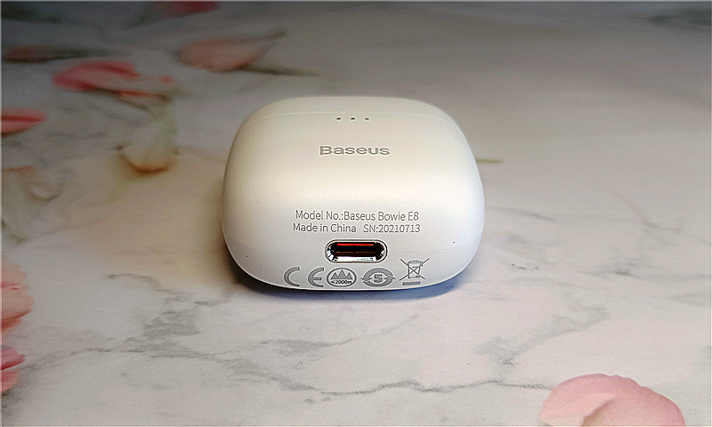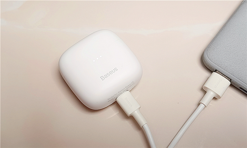 倍思E8的充电盒内置一块容量为350mAh锂电池,充电时间大约1小时。充电盒充电时,3盏LED指示灯会依次开始闪烁,每充满30%电量,一盏灯就保持长亮,直到3盏灯全部为长亮时,充电盒电量即充满。
