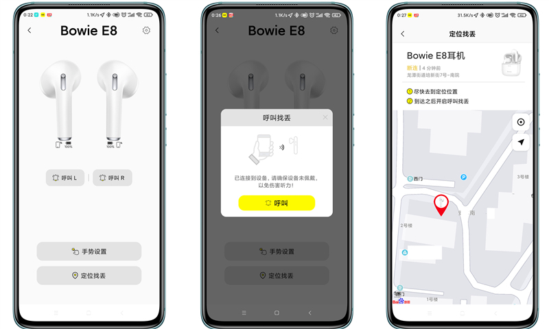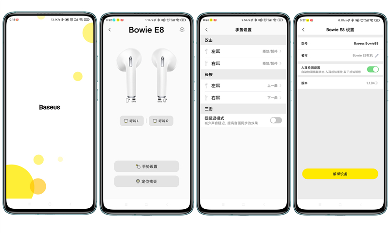 另外,倍思还研发了同名APP辅助进行功能设置。按操作步骤提示,可将E8添加至设备列表,接下来就可在设备界面修改“操作手势”、“呼叫耳机”和“定位查找”等功能。另外,在APP的设置界面还可以选择“入耳检测”功能的开启或关闭,以及设备解绑等功能。