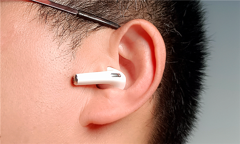 耳机还应用了一项超酷的入耳检测技术,耳塞头内侧的双斜杠就是入耳检测面板。(从APP中)开启该功能后,摘下耳机会暂停播放,再次戴上自动续播,反应灵敏、切换自如。