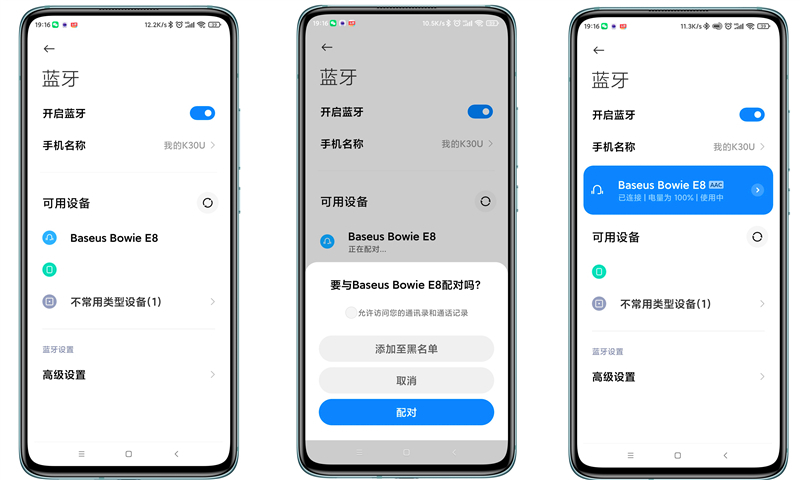 打开手机蓝牙界面,会自动搜索到“Baseus Bowie E8”的蓝牙设备,点击后会弹出配对提示窗,允许后配对成功。此时,耳机设备界面还会显示连接状态、电量和AAC高级音频编码格式等信息。
