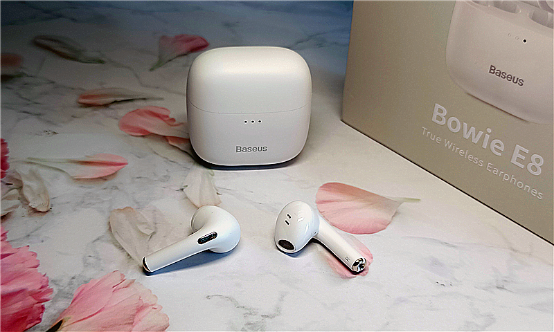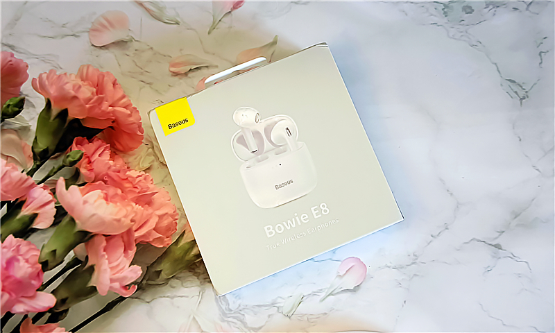 倍思E8的包装盒简约精致,乳白色盒体,盒面正中是耳机和充电盒的高清实物图,纯白色机身,图片下方是耳机具体型号——Bowie E8;盒体左上方印着倍思的英文名称——Baseus,品牌辨识度极高。