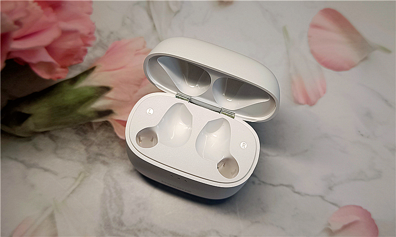 充电盒为上掀盖式设计,前高后低的倾斜式上盖,可掀开约90度;盒内是两个左右对称的充电槽,充电触点位于充电槽底部,同时为了便于区分左右耳,充电槽外侧还分别印有L、R标识。