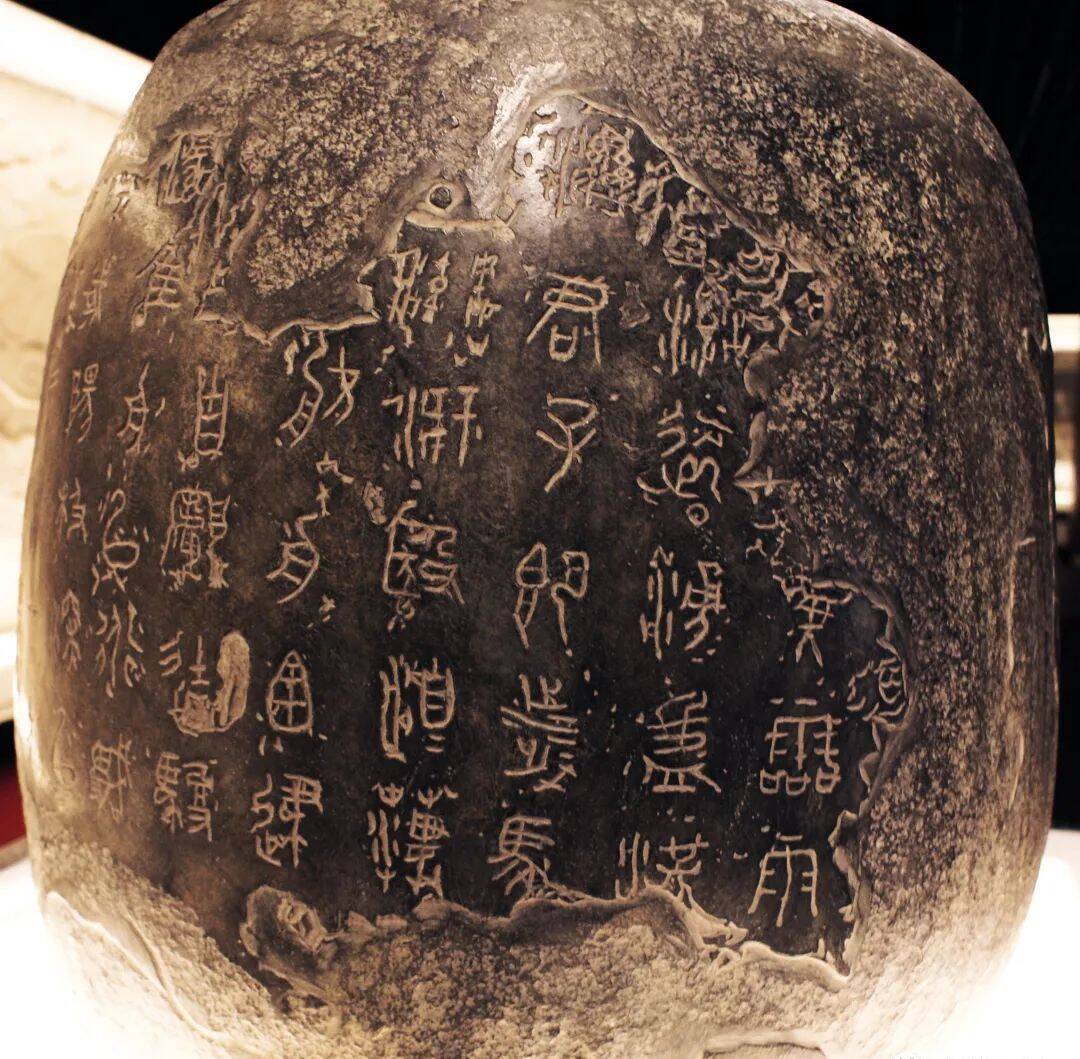 石鼓文,秦刻石文字,因其刻石外形似鼓而得名。发现于唐初,共十枚,高约二尺,径约三尺,分别刻有大篆四言诗一首,共十首,计七百一十八字。