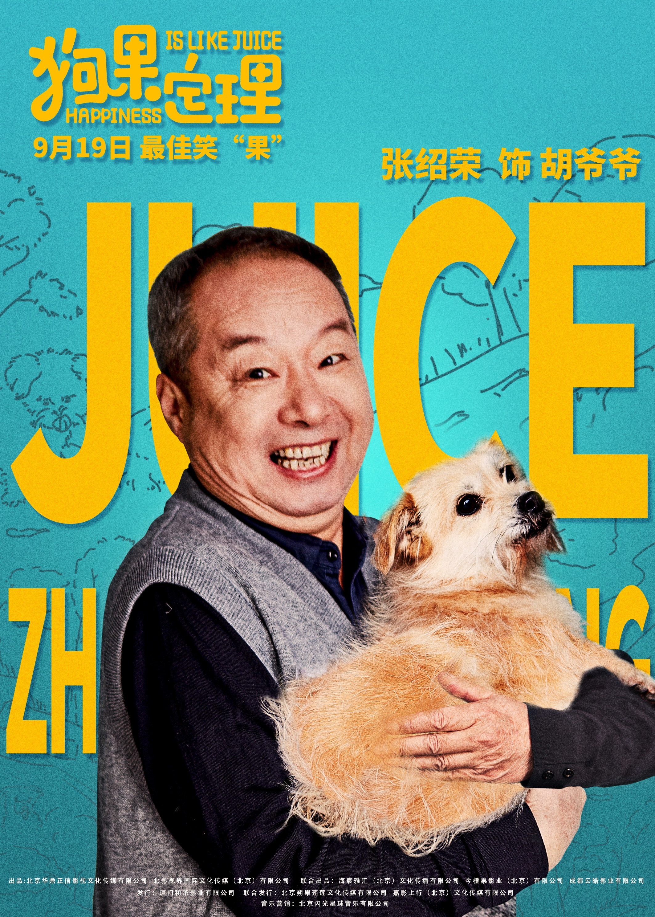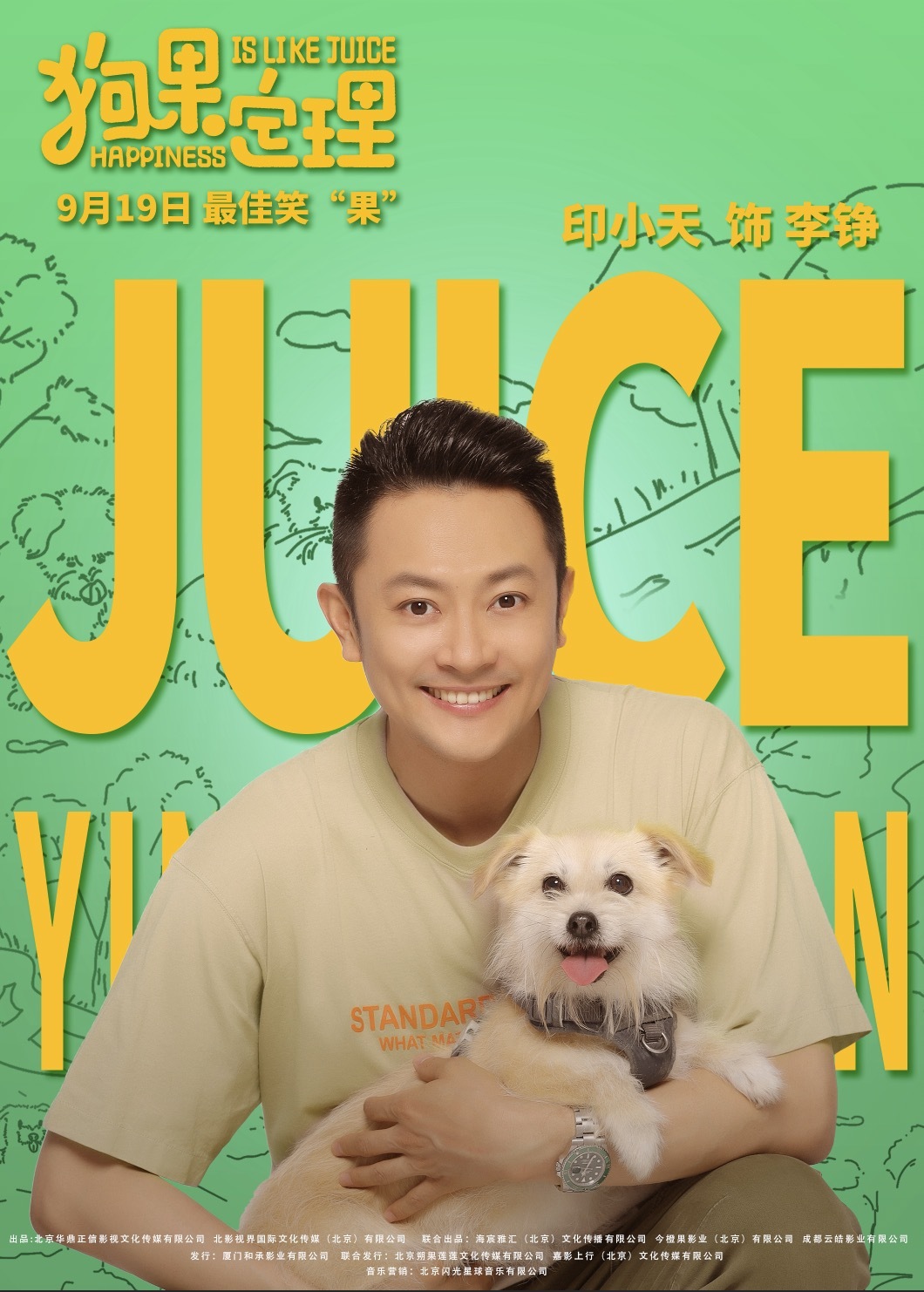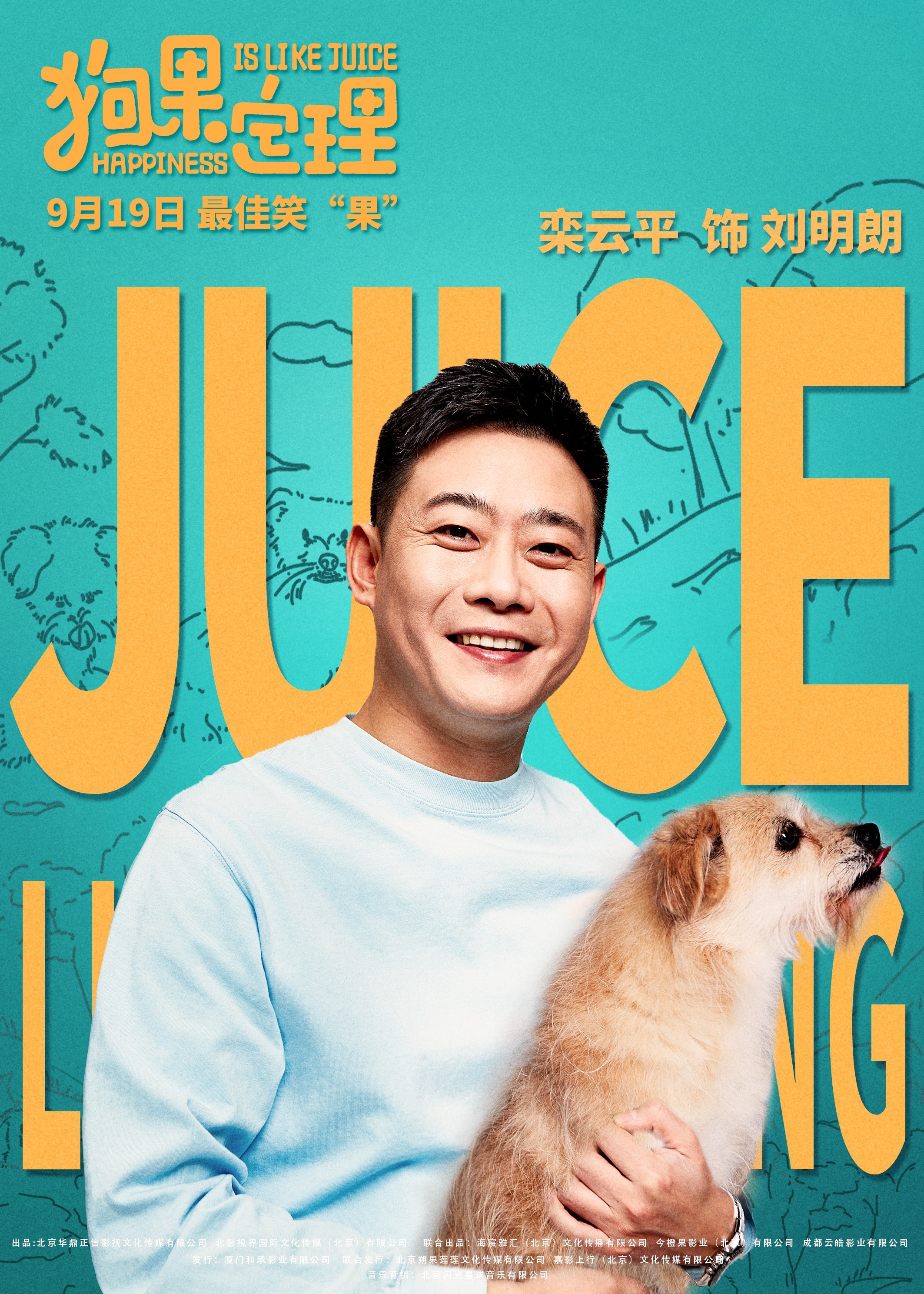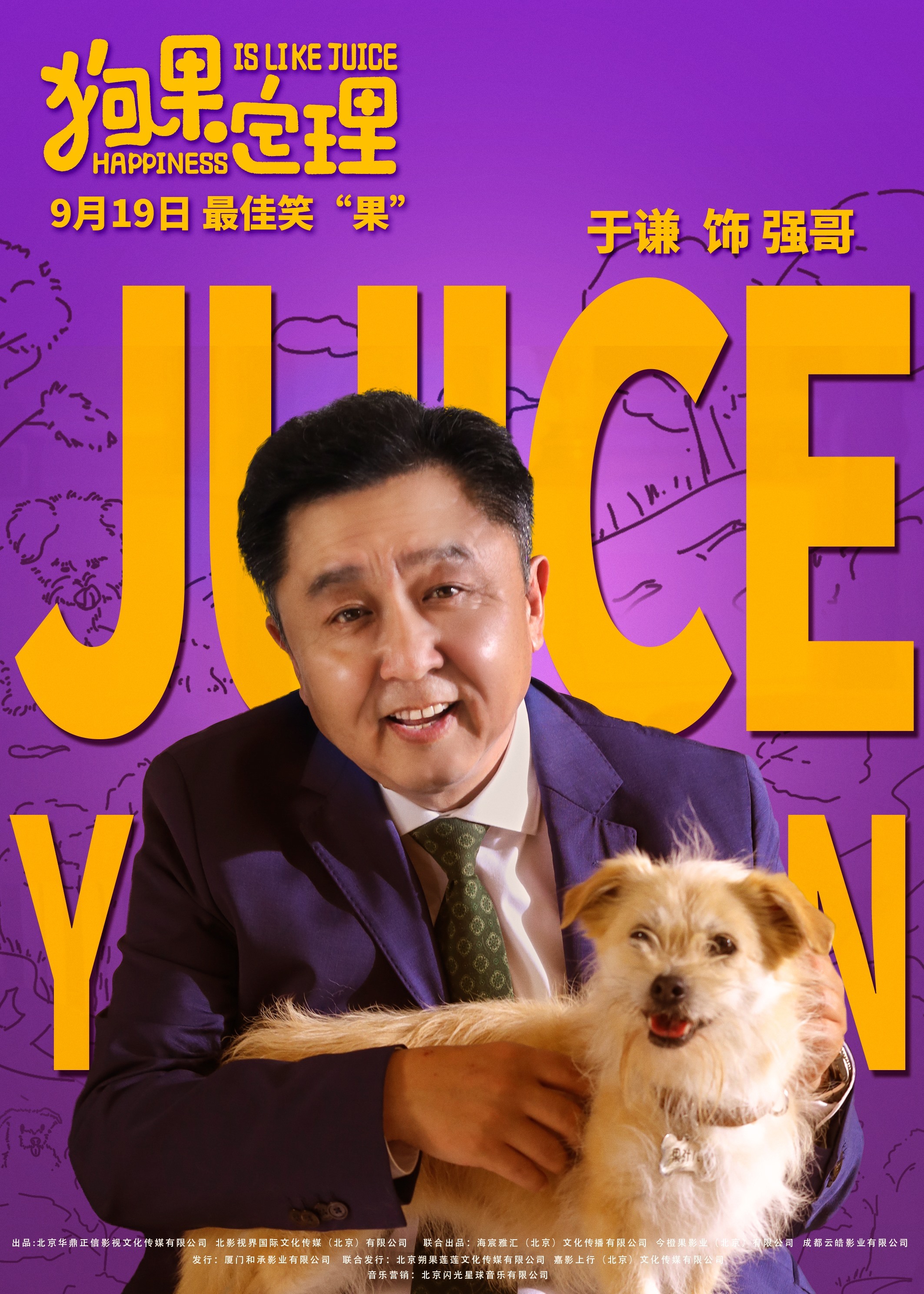 其中,狗狗果汁儿是本片的灵魂,在今日发布的角色单人海报中,都市众生相被展现的淋漓尽致,每个人都在与果汁儿的相处中试图寻找属于自己的幸福定理。于谦饰演的强哥在喜感富态的外表下透着一丝圆滑,像抱着“宝贝儿”一般把果汁儿紧紧抱在怀中;贾冰饰演的秦铁军神情小心翼翼,而果汁儿则惬意地端坐在他的臂弯里,两者的关系显得很不寻常;印小天饰演的李铮则怀中抱着果汁儿面带微笑,对未来的生活抱着十足的热情和希望。其他人物与果汁儿之间或温馨、或逗趣的相处方式也令人不禁畅想,有狗狗陪伴的生活将会如何多姿多彩。