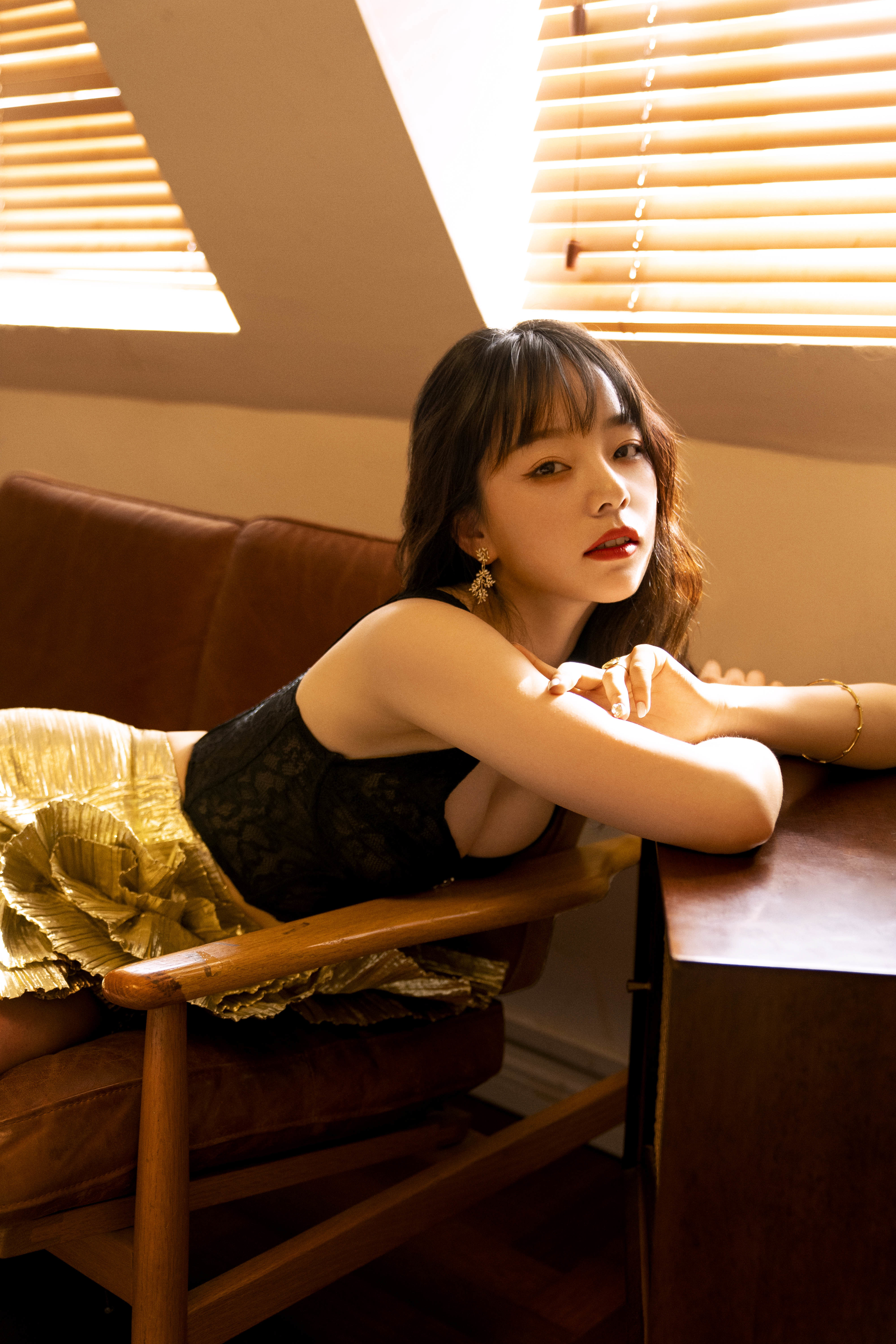 李雨蔓一身低胸纯黑吊带搭配金色光泽感十足的短裙,性感与高雅兼具。