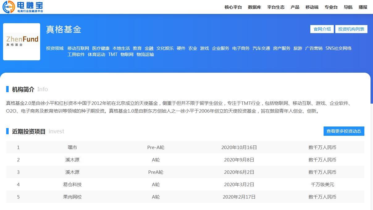 网经社“电融宝”(FA.100EC.CN)投资方库显示,真格基金是由徐小平、王强先生于2011年联合红杉资本中国基金创立的早期投资机构,累计管理资金总规模超10亿美元。侧重于但并不限于留学生创业,专注于TMT行业,包括物联网、移动互联、游戏、企业软件、O2O、电子商务及教育培训等领域的种子期投资。近期投资项目包括嘿市、溪木源、易仓科技等。