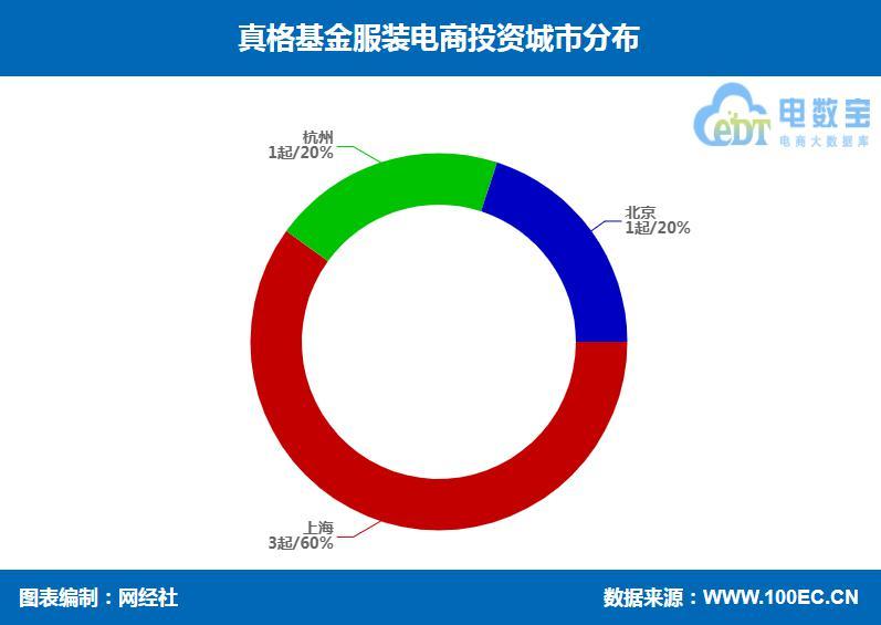 真格基金服装电商投资的城市分布上,上海达3起,占比60%;杭州、北京各占1起,各占20%。
