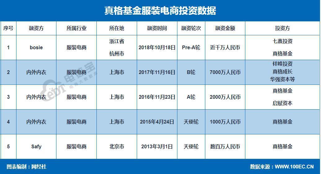 据网经社“电数宝”(DATA.100EC.CN)大数据库显示,2009年5月1日至2018年10月18日,真格基金累计参与投资了5起服装电商的投资,涉及金额超1.1亿元,涉及公司分别为bosie、内外内衣、Safy,其种仅内外内衣就参与投资三次。