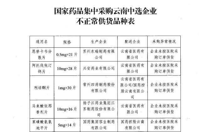当时云南省医疗保障局称,经核实,无合理理由的,云南将按照相关规定将供货情况纳入该省医保信用监管记录和报国家联采办,并按规定替补相关药品,保障医院的药品供应。