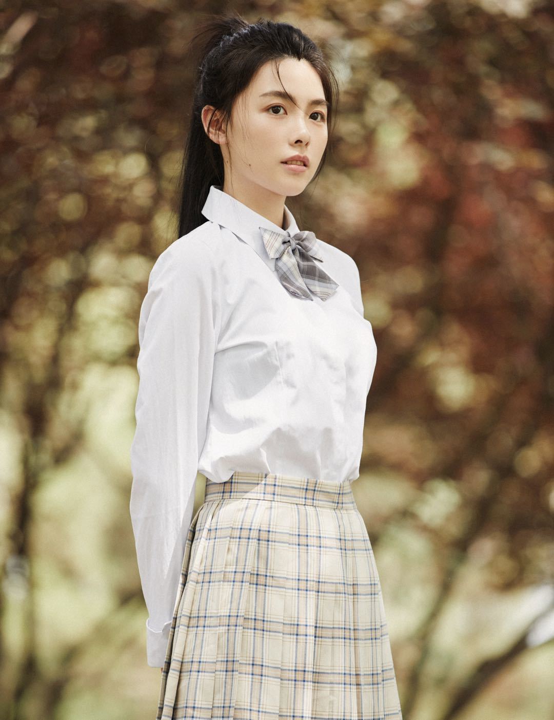 近日,龙韬娱乐新签约艺人钟雅婷的一组写真曝光,照片背景在初秋路边的梧桐树下,钟雅婷身穿白色衬衫,系着浅灰格纹蝴蝶结领带,搭配浅黄色褶皱格纹小短裙,气质纯粹干净,笑容清新治愈,散发出的甜美学生气息如同初恋少女一般,令人心动。