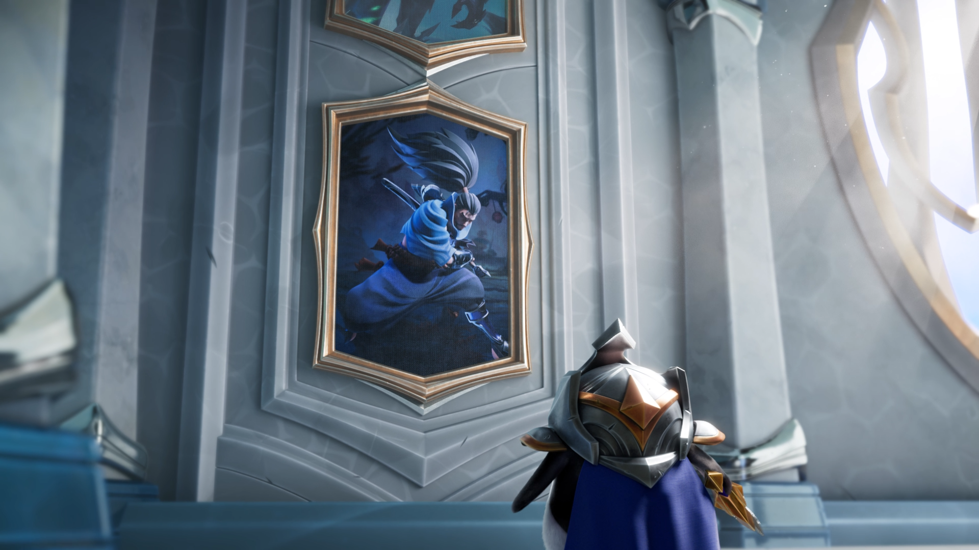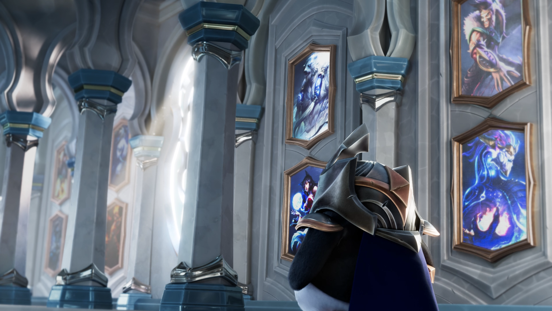 在半路上,走廊两边的墙壁挂着许多英雄的画像,大家看着是不是非常眼熟?没错画像中的正是手游时空裂痕版本的几个热门英雄。而羽饰骑士所经过的地方也一座金铲铲之战名人堂,坐落着许多玩家们熟知的人物。