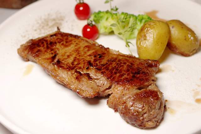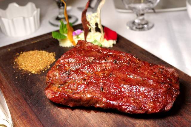 原切和牛肉眼扒(5分):肉眼可见的原切大块,厚实,色泽红亮醒目仿佛一整块未经打磨的高品质红宝石,璀璨迷人。