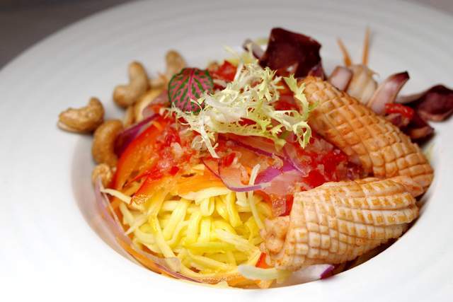 酸木瓜沙拉:酸酸的青木瓜丝,搭配红椒丝(不辣),点缀花刀鱿鱼卷和炸熟的腰果。看着好看不过吃起来感觉互不相干。要是能再给点辣度较高的辣椒油拌,我就高兴可能别人就不高兴啦。