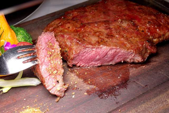 牛小扒(7分):怕生的朋友,大概会更欣赏这块7分熟的牛小扒,这种肉肥瘦相间还带一点肉筋,切块后蘸点胡椒海盐粉吃。层次感较丰富,熟一点吃起来还较适口。