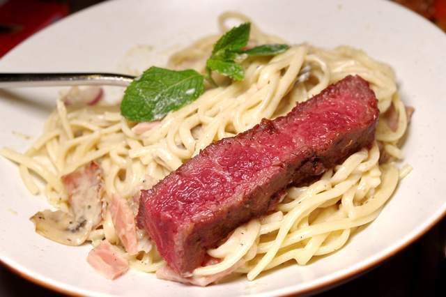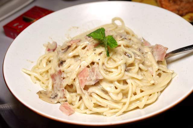 蘑菇烟熏火腿意面:这个做法完全是传统的“正宗意式”,碎芝士奶油香明显,口感滑润,但我觉得难免腻人,且不像大多数中餐面条,有足够的面码辅佐。