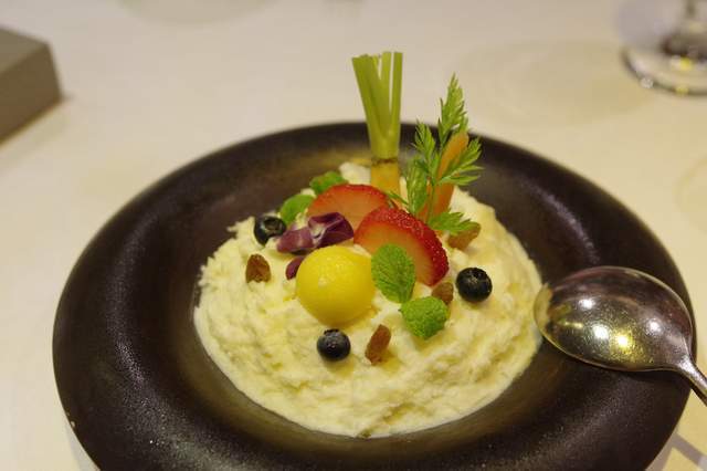 土豆泥:这土豆泥绵密却又带有独特的质感,奶香味浓口味微甜微酸,很是特别。