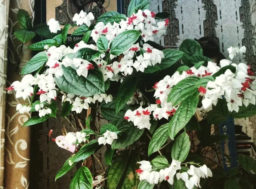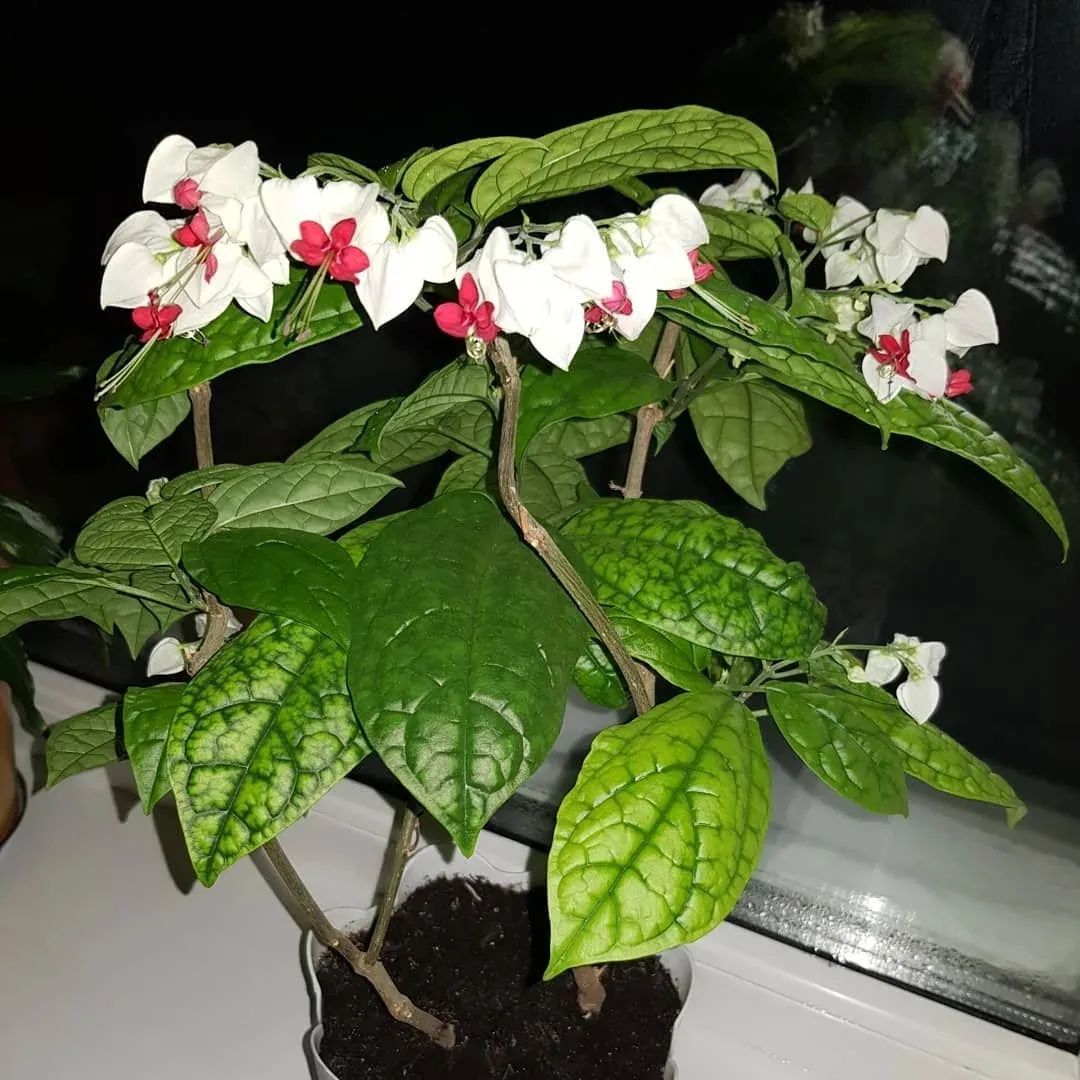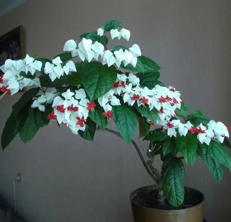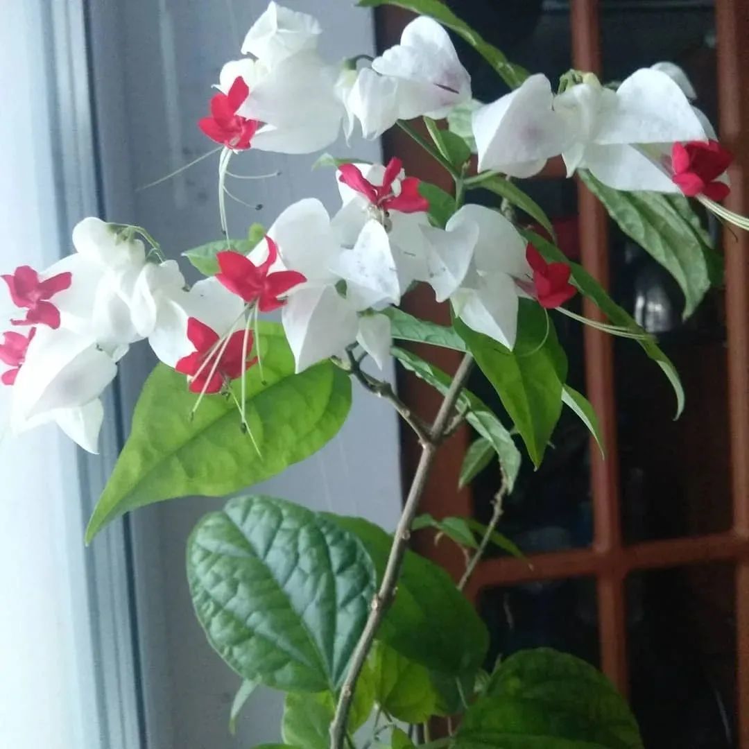 龙吐珠(Clerodendrum thomsoniae)是很适合养在半阴处的,它是大青属的开花灌木,有着卵形的翠绿叶子,花朵如同一个个小铃铛,花朵一般由白色和红色组合而成,有较长的花蕊伸出来,形成独特的观感。