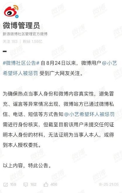 这份公告说,为确保热点的当事人身份和微博内容真实性,避免冒充、谣言等异常情况出现,微博站方已通过微博私信、电话、短信等方式告知微博用户名为小艺希望坏人被惩罚需进行身份核实。但截至目前,该用户未提交任何证明本人身份的材料,无法证明为当事人本人,或得到本人授权委托。