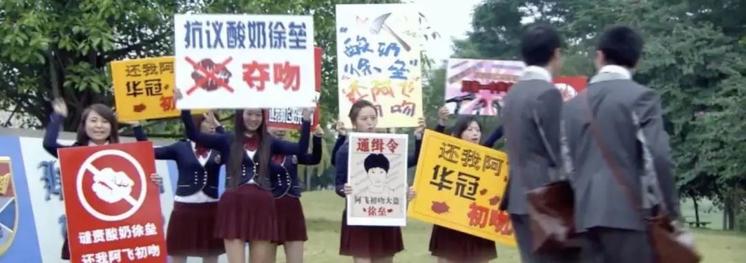 再比如女主不小心夺了男主初吻后,竟然有一堆像手机大卖场销售的女生游行举牌反对,牌子上书:抗议酸奶徐垒夺吻。而男主则在歪嘴一笑后轻嗤了一句“小笨蛋~”。