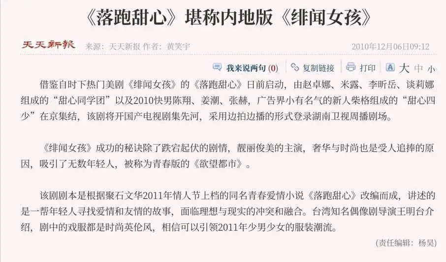 且不说对“靓丽俊美”“奢华时尚”有什么误解,明明就是在山寨《偷偷爱着你》,它却碰瓷《绯闻女孩》。