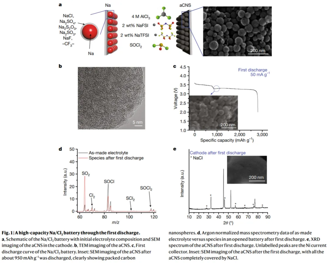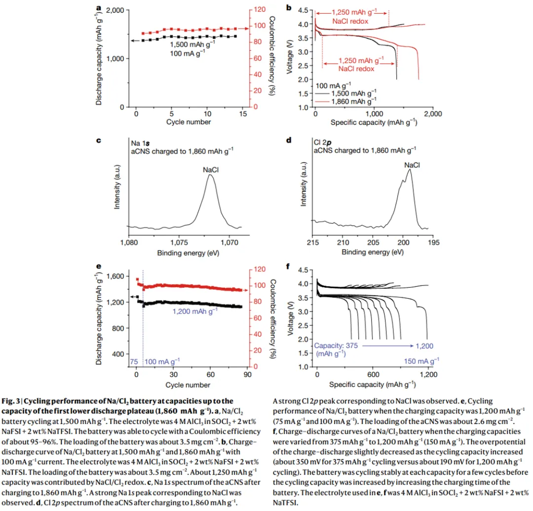 对于使用的氯化钠(Na/Cl_2)电池,其中无定形碳纳米球(amorphous carbon nanospheres, aCNS)作为阴极, SOCl_2 中的氯化铝(AlCl_3)作为起始电解质中的主要成分。该电池在工作 / 循环放电电压为 3.5 V,容量最高达 1,200 mAh g−^1 的情况下工作 / 循环超过 200 次,库伦效率(Coulombic efficiency)和能量效率(energy efficiency)分别为 99% 和 90% 以上。