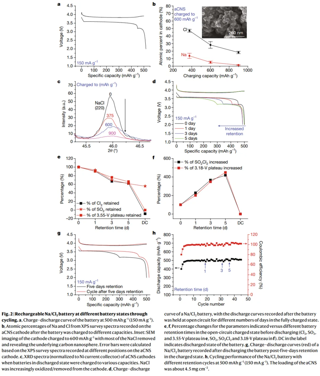 当电池第一次放电后再充电时,Na 沉积在 Na 电极上,NaCl 沉积在 aCNS 电极上被氧化(约 3.83 V)(图 2a)形成 Cl_2,存在于 aCNS 电极中的大量孔隙中(扩展数据表 1)。