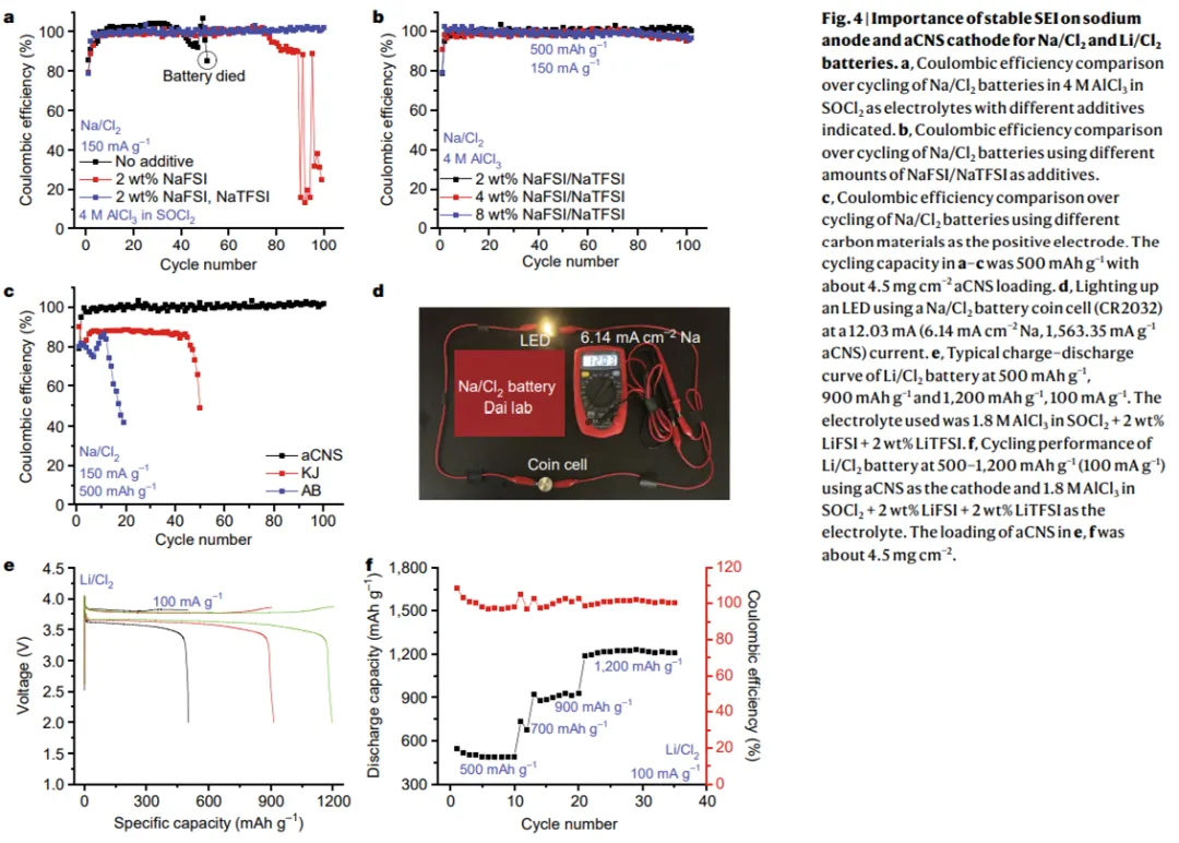 下图 4 展示了在 Na/Cl_2 和 Li/Cl_2 电池中,稳定的 SEI 对钠阳极和 aCNS 阴极的重要性。